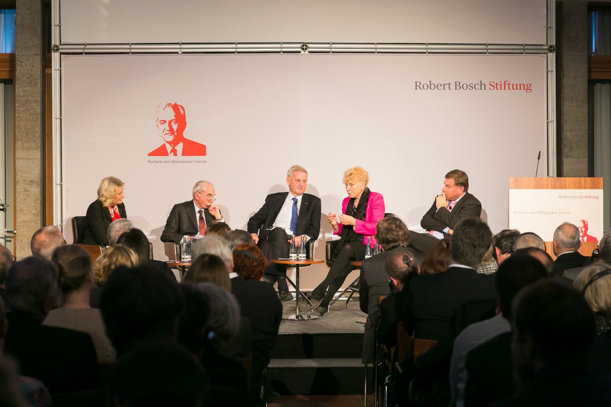 Die letzte Gesprächsrunde des Richard von Weizsäcker Forums legte den Fokus auf Deutschland und dessen Verantwortung im Umgang mit Krisen. Durch Öffnung seiner Grenzen habe Deutschland angesichts der Flüchtlingsströme richtig gehandelt, auch wenn dies eigentlich entgegen der Dublin-Regeln zum EU-Asylverfahren war, sagte François Heisbourg, Leiter des International Institute for Strategic Studies. In seinem Impulsbeitrag kritisierte er jedoch, dass Deutschland in anderen Krisenfällen oftmals zu zögerlich handelte und seine bevorzugte Einflussnahme mittels „Soft Power“ aktiver erfolgen müsse. Als Land im Herzen Europas und politisches sowie wirtschaftliches Schwergewicht läge es an Deutschland, Europa zusammenzuhalten, so Janusz Reiter, Vorsitzender des Centre for International Relations und ehemaliger polnischer Botschafter in Deutschland. In der Flüchtlingsfrage forderte er mehr Solidarität von allen europäischen Ländern.